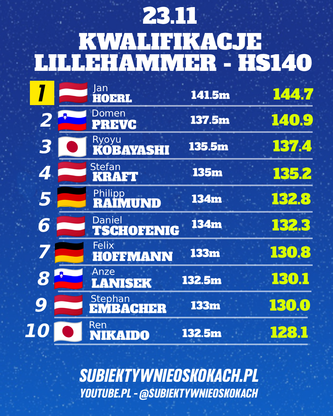 W dzisiejszym konkursie zobaczymy także Aleksandra Zniszczoła, który wywalczył awans z 34. miejsca. Wczoraj nie oglądaliśmy go w zawodach z uwagi na wpadkę w kwalifikacjach. Najgorzej z biało-czerwonych wypadł tym razem Dawid Kubacki, plasując się na 37. miejscu po skoku na 123 metry.